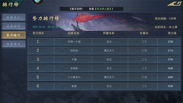6、排行榜支持查看全服玩家的势力排名情况,毕竟知己知彼,才能在竞争中占据优势。