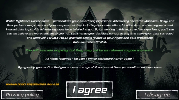 1、在本站下载《冬季噩梦》游戏后启动游戏,点击“lagree”开始游玩;