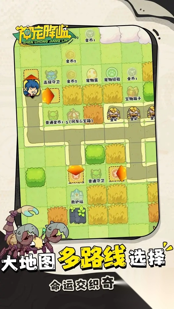 《神宠降临》是一款卡通风格的休闲卡牌策略游戏,巧妙融合了Roguelike随机机制与深度阵容构建玩法,为玩家带来充满未知变数的冒险乐趣。游戏内提供超600种技能供玩家自由搭配组合,每一次关卡选择都像开启神秘盲盒,随机事件轮番上演,让挑战与惊喜时刻伴随冒险进程。玩家可通过不同宠物与技能的灵活搭配打造多样化阵容,打破传统卡牌游戏“强卡定胜负”的固化模式,即便是冷门角色也能在战场上绽放独特光彩。除了丰富的主线冒险内容,游戏中的竞技擂台玩法同样极具挑战性,充分考验玩家的操作技巧与策略思维的配合能力。