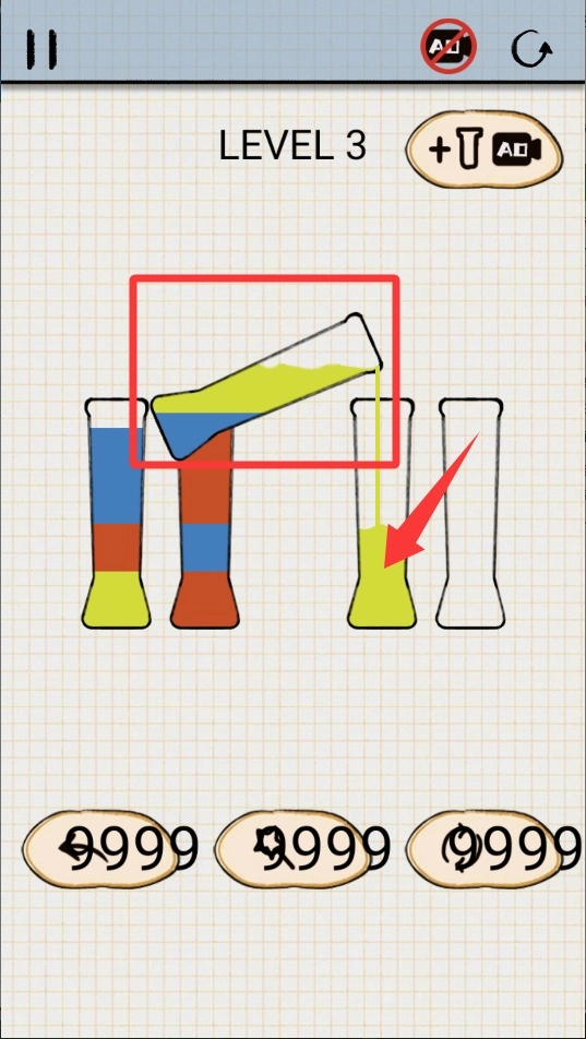 1、基础规则简单易懂,点击选中试管后倾倒同色液体即可。需要注意的是,只有上层液体颜色相匹配时,转移操作才能成功完成。