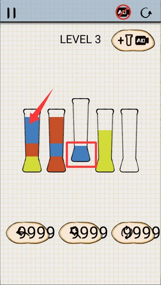 2、先点击选中一个试管,接着点击目标试管,即可将液体倒过去;每次仅能转移试管内最上层的同种颜色液体部分。