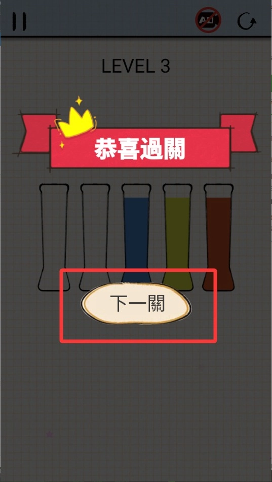 4、待所有试管内的液体颜色变得完全一致、不再有任何混杂后,系统便会自动判定为通关,并解锁难度更高的关卡供玩家挑战。
