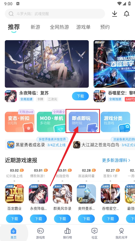 1、打开光环助手,进入首页,点击"即点即玩"。