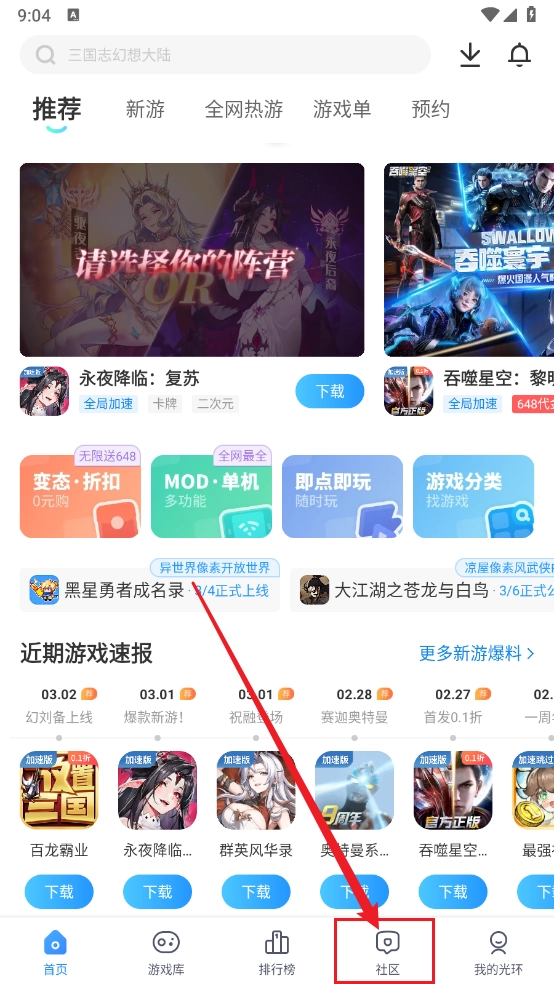 1、进入首页,点击"社区"板块。