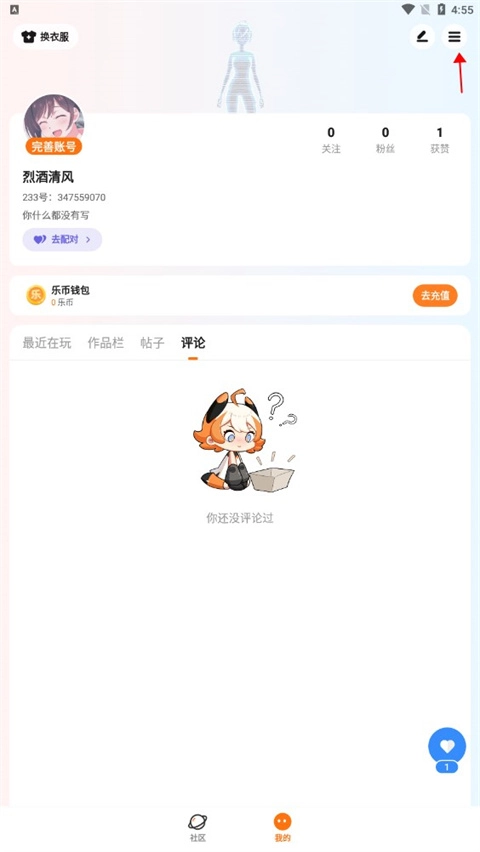 1、打开233乐园,点击“我的”,再点击右上角箭头所指的位置。