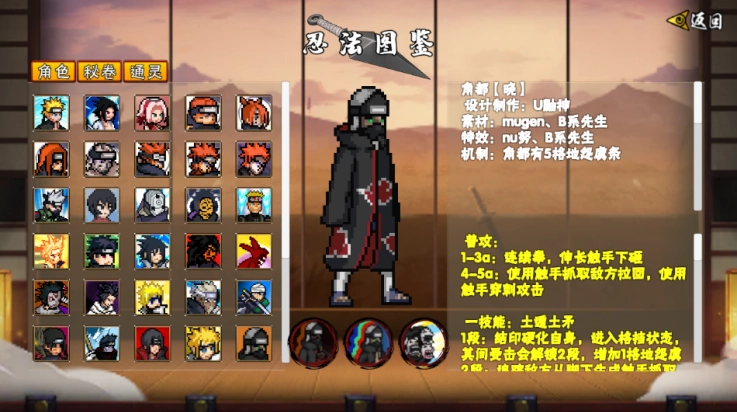 像素火影次世代角都这款动作格斗游戏,以火影忍者的世界为背景打造而成。玩家能自由挑选众多高人气的忍者角色,每个角色都具备高度还原原作的经典技能,搭配上流畅的连招机制,不管是独自体验游戏内容,还是和其他玩家展开对战,都可以充分感受到纯粹的操作乐趣,以及激烈战斗带来的爽快体验。
