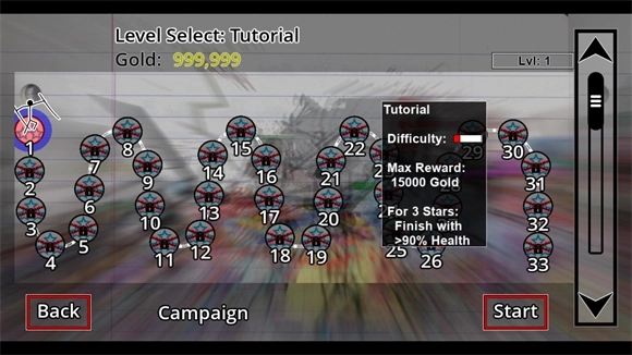 2、点击start后会进入关卡选择界面,选择想玩的关卡,再点击右下角的start就能开始游戏了。
