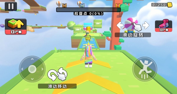 3、通过虚拟摇杆来控制角色的移动,滑动屏幕就能完成跳跃、旋转之类的动作,以此躲避障碍物、跨越机关,朝着关卡的终点前进。