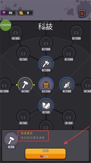 4、在科技界面消耗【50】钻石解锁【快速建造】,提升居民建造速度,加快营地设施建设与发展进程。
