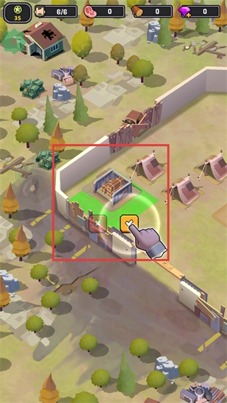 1、游戏界面中红框所标注的区域为建造区域,按照手指的指引点击黄色的建造按钮,此时界面顶部会显示【35】【6/6】之类的数值,以此完成基础的建造操作。