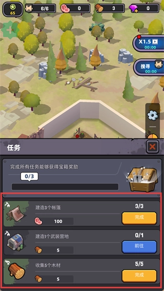 2、任务界面红框含【建造3个帐篷-3/3】【建造1个武装营地-0/1】等任务,完成项点击【完成】按钮领取奖励。