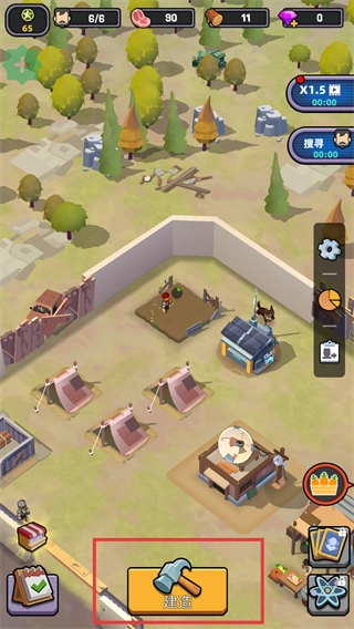 3、游戏场景红框标注带锤子图标的黄色【建造】按钮,顶部数值【65】【90】【11】等,点击按钮启动建造流程。