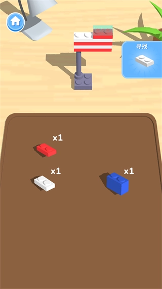 3、按照右侧【寻找】提示里的白色积木,把它拼接到已有的结构上,让积木模型的造型更加丰富。