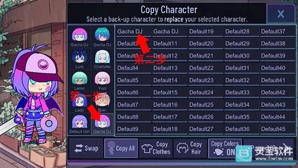 2、接着来到人物备份界面后,左侧为我们当前已创建角色,右侧为角色备份区域,如果我们要复制某个角色的话,首先在左侧选中想要复制的角色后,再点击右侧备份区域中的某个Default选项,来将我们的角色备份至备份中