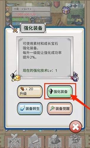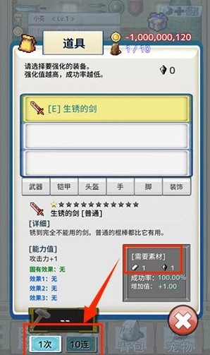 挑选想要提升战力的武器,使用对应的道具来增强它。你可以选择一次一次地强化,也可以直接进行十次连续强化。