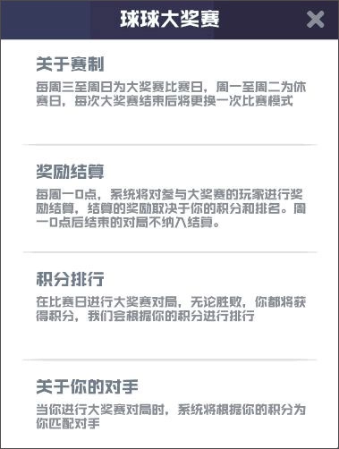 大奖赛的比赛周期为一周,每周三到周日是比赛日,周一和周二则是休赛日。每届大奖赛结束后,都会更换新的比赛模式。球宝们参赛时记得留意当周的比赛时间和对应的比赛模式,可别错过了呀~