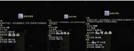 最核心的建筑是微型处理器、逻辑处理器和超核处理器这三种。所有处理器指令都在这三类处理器的建筑结构中运行。这三种处理器本质上并无不同,主要差异体现在运算速度、建造成本、运行条件以及连接范围上。这些差异在它们的属性面板中能很直观地看到(见下图)。