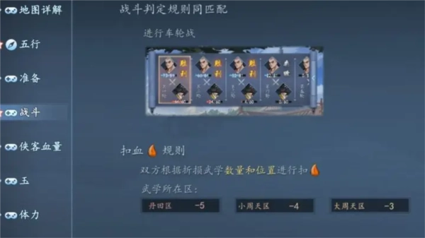 武学的施展方式可分为主动发动、追击触发与前置蓄力三种类型;战斗过程中,角色的行动次序由速度属性决定,若速度值相同,则通过随机方式排序。此外,武学所具备的“气量”特质,能够为其所属的战斗区块补充生命值保障。