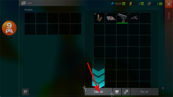 在游戏里,点击Take all按钮就能拾取所有资源,这是积累武器、弹药和道具的关键步骤,能帮助你快速提升战力。