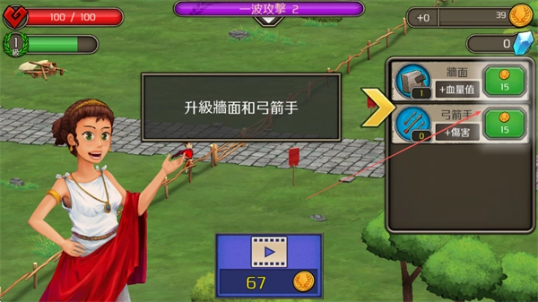 在第二波攻击时,花费金币升级城墙以增加生命值,并升级弓箭手来提升伤害,从而增强防御能力。