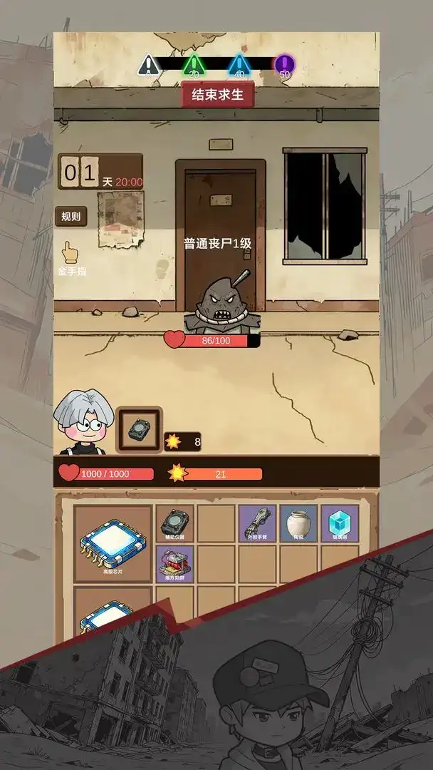 当遭遇僵尸时会触发战斗,背包内的物品数量越多,你的战斗力就越强大;一旦僵尸的血量降至零,你便能赢得胜利并继续展开探索。