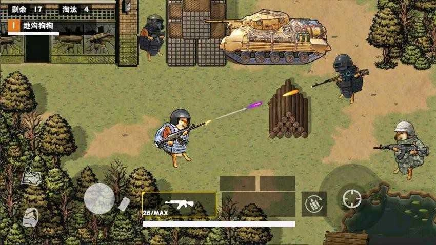 通过左下角的移动摇杆操控小狗移动,规划行进路线以接近敌人或资源点,同时注意查看界面信息来应对突发状况。