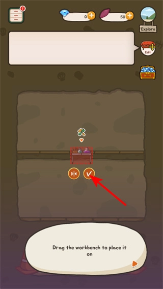 布置工作台时,先把它拖到合适的位置,接着点击对勾按钮确认放置,这样就完成了工作台的布置,为之后制作物品打下基础。