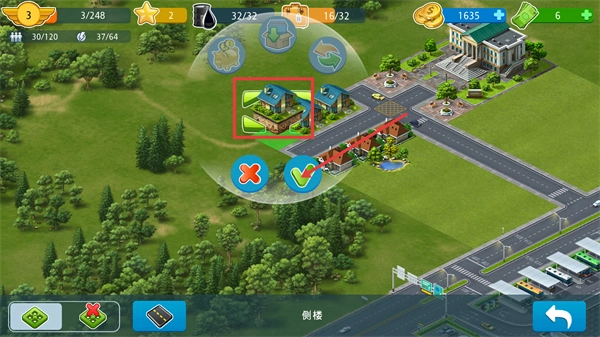 在地图上挑选合适的位置,点击对勾确认放置【侧楼】,完成建筑布局来推进城市建设。