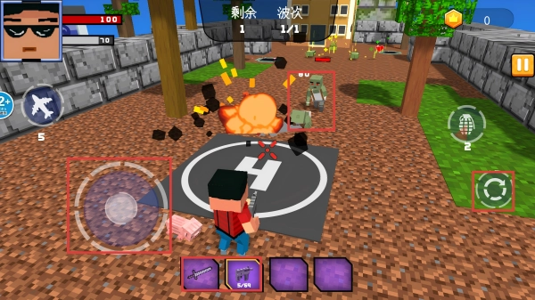 在战斗场景中,通过左侧的虚拟摇杆来操控角色移动,对准出现的僵尸后,点击右侧的射击按键发起攻击,要是碰到大批僵尸,还能切换威力更强的武器。
