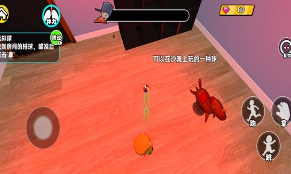 找到排球这类任务物品后,点击对应的按钮将其拿起,瞄准目标方向后再次点击,就能把它投出去。