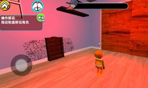 拖动左下角的轮盘,就能让角色灵活移动,这样你可以熟悉房间的布局,为之后规划捣蛋路线做好准备。