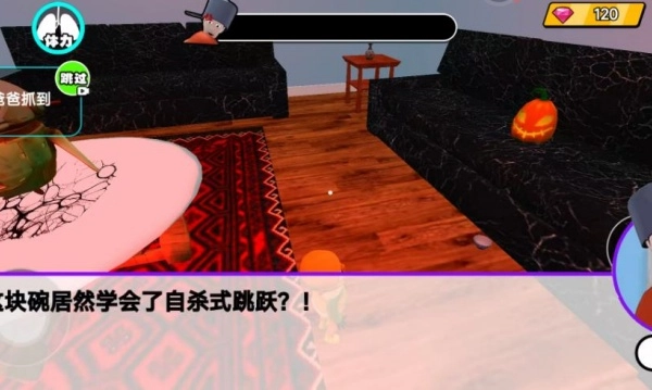 在客厅调皮捣蛋的时候,如果看到沙发上放着南瓜之类的东西,可以借助它们来转移爸爸的注意力,另外还要留意自己的体力情况,要是体力不够了就赶紧找个隐蔽的地方恢复一下。