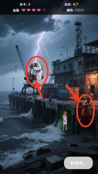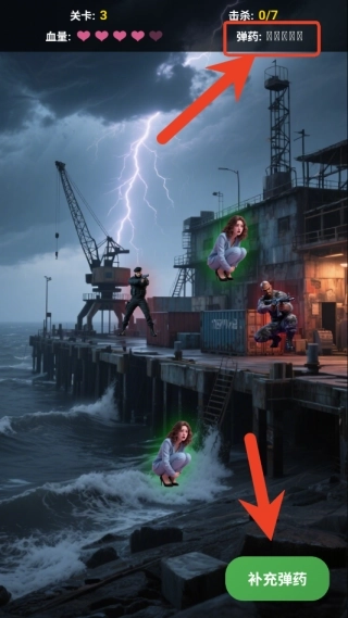 3、一旦匪徒出现,务必立刻瞄准并将其击毙,绝对不能误伤到人质!提醒:子弹数量有限,射击之后要迅速点击“装弹”按钮来补充弹药。