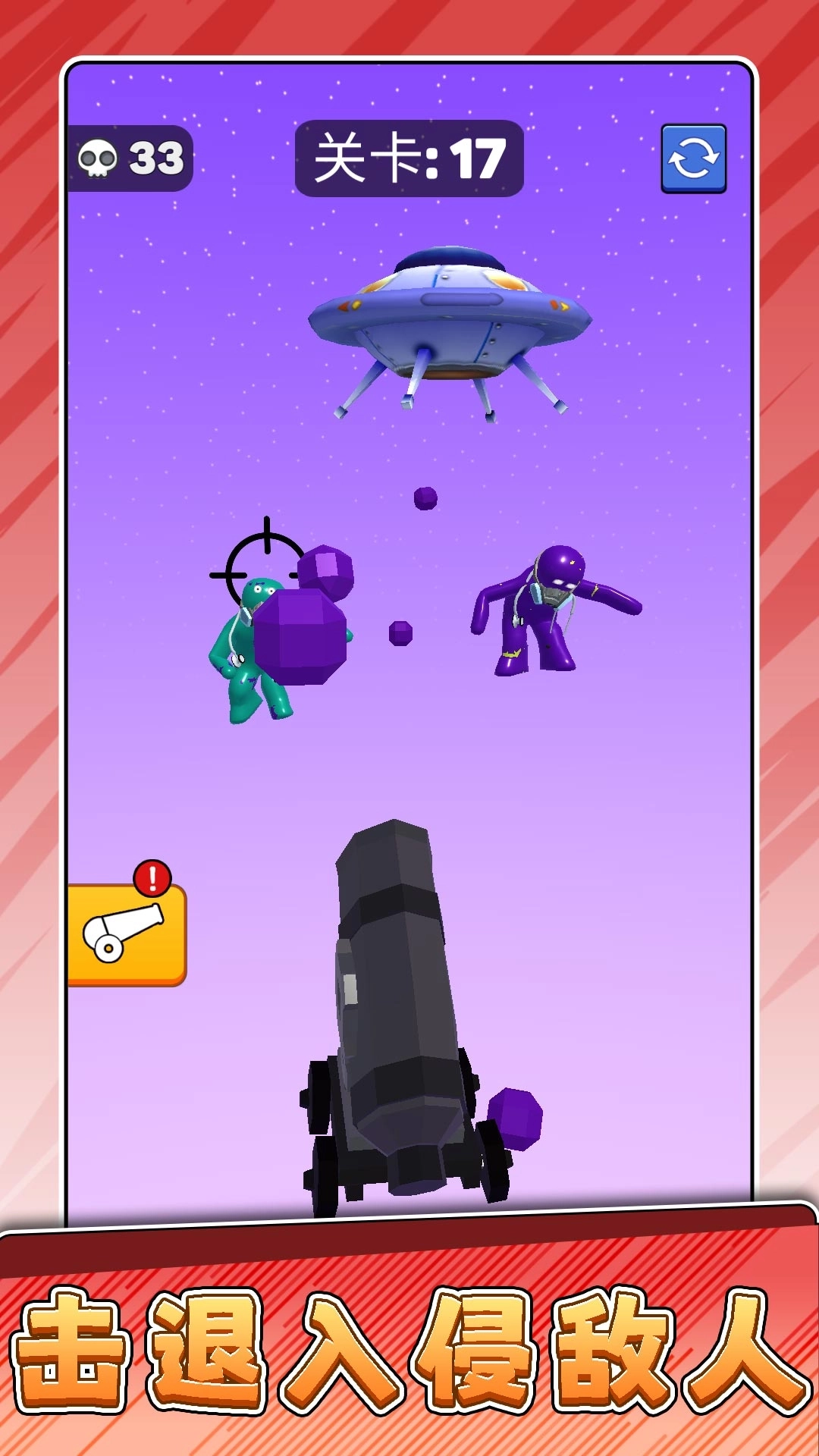 1、在指定关卡里,操控炮台发射弹丸击退来犯的敌人,守护场景内的目标,只要成功抵挡所有敌人就能通关。