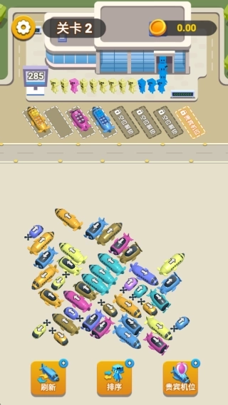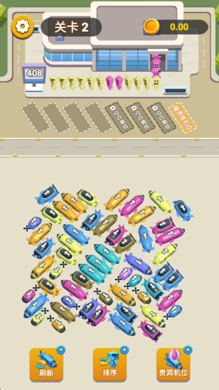 1、游戏启动后,首先通过俯视图观察停车场布局,明确目标车辆位置与出口方向,同时掌握各车辆朝向及移动限制规则。