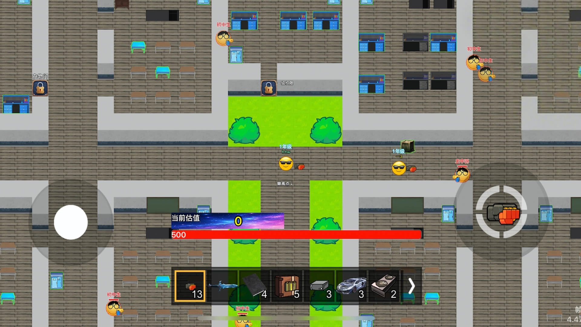 2、借助左侧的虚拟摇杆来操控角色移动,在课桌的缝隙之间、走廊的转角等处搜寻枪械、弹药以及高价值的物资