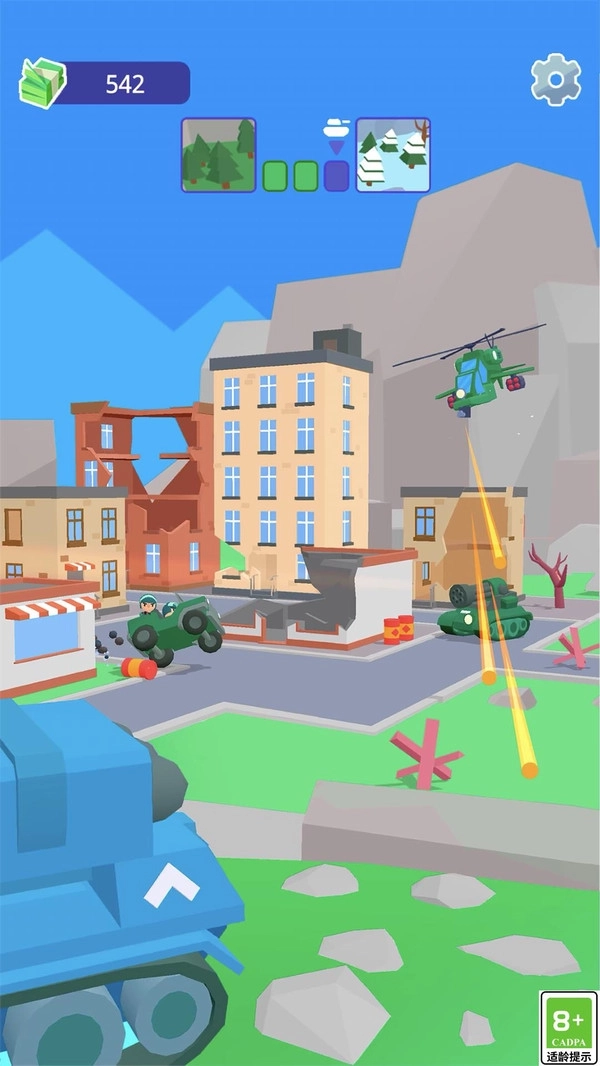 1、战场类型包含开阔沙地、狭窄巷战区、掩体密集的工业区以及地形起伏的山地战场。每种场景不仅拥有独特的视觉表现,还会直接作用于战术选择。