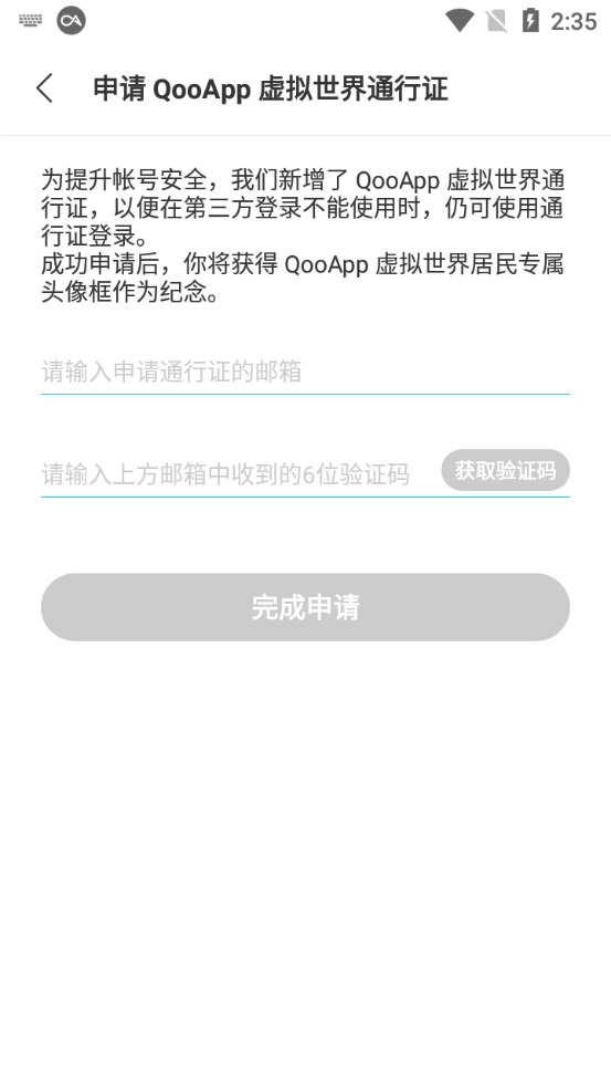 2、当点击“游客登录”时,页面将跳转至此。在此页面,点击左上角按钮,可返回主页面;若想申请Qoo虚拟世界通行证,直接填写下方相应信息即可。