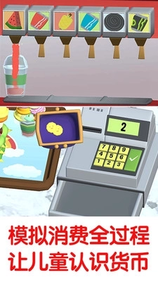 2、除了进行制作活动外,还会设置收银台环节,通过这个过程引导小朋友认识货币、学习价格计算,同时也让他们了解水果的名称。