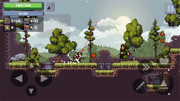 控制角色移动,攻击场景里的怪物,收集苹果类道具。