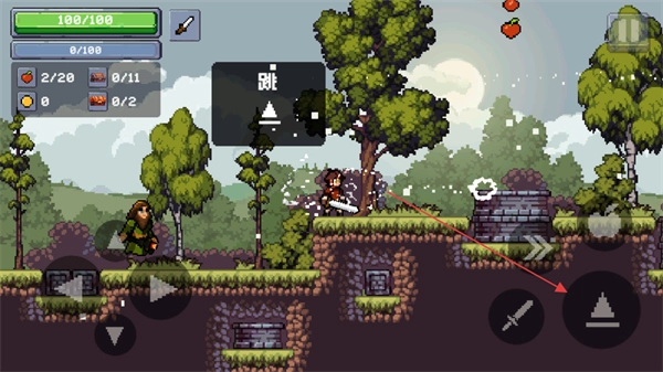 执行跳×2的二段跳操作,获取高处的苹果道具。