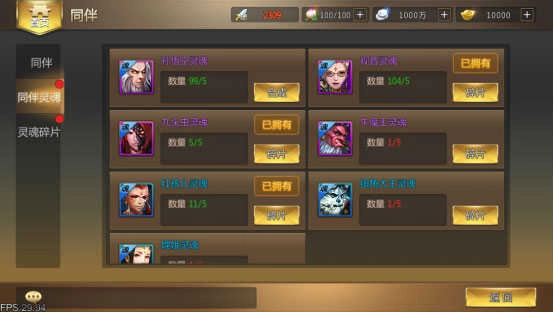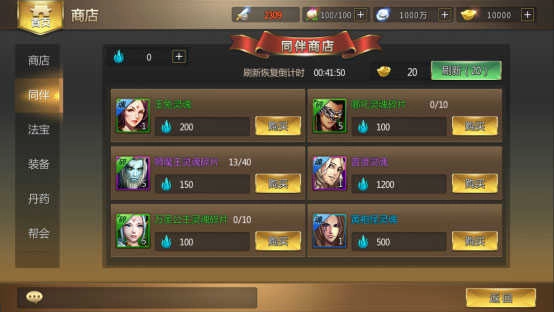 玩家上阵时,最多能有2个同伴同时在场。当前同伴具备紫色、蓝色、绿色这3种品质,其成长体系和主角大体相同,同样涵盖装备、法宝、技能以及成长等功能。同伴需通过同伴灵魂合成,而同伴灵魂又能由同伴灵魂碎片合成,合成步骤在同伴界面即可完成。这些所需材料主要从【抽奖】与【同伴商店】获取。在【抽奖】环节,有机会直接得到同伴整卡,要是玩家已拥有该同伴,抽到的同伴整卡会自动转化为5个同伴灵魂。在【同伴商店】里,玩家能够使用神魂来兑换同伴灵魂与同伴灵魂碎片。