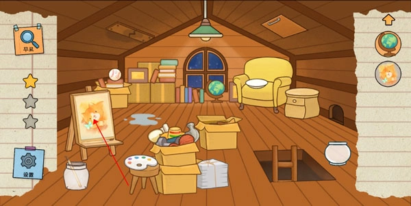 3.拉开窗帘可以找到小鸟,往下拖动杯子可找到袜子,点击床边的点灯开灯就有了发光的台灯,往上拖动椅子上的书本,将其挪到可以找到草莓绳子。