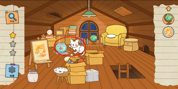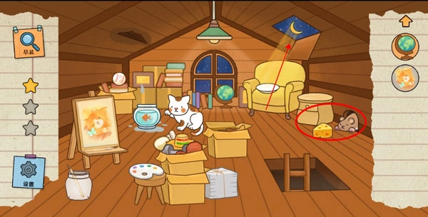 4.将房顶打开,月光照射到沙发上出现奶酪,将奶酪放在老鼠洞口会吸引一只猫咪前来。