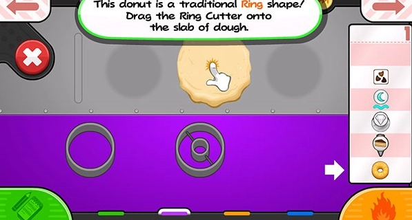 5、关于【配料】,可以滑动切换到顾客所需要的配料,然后把它撒在甜甜圈上面。