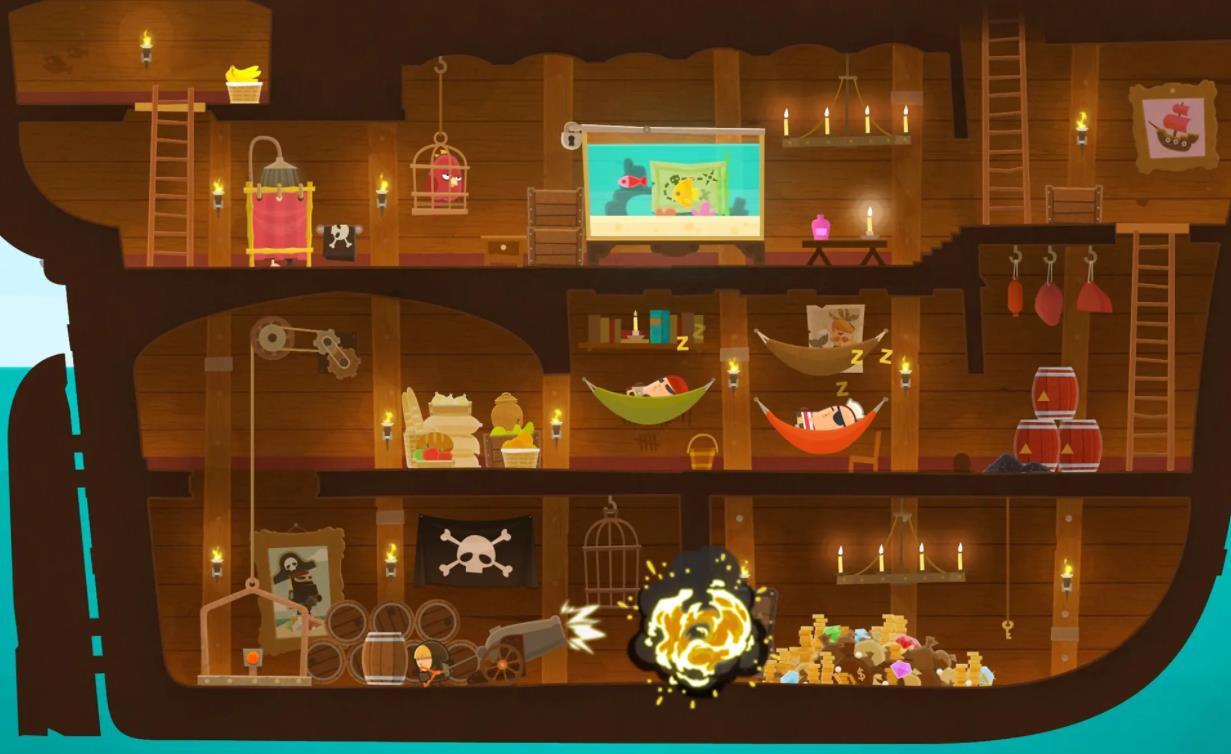 3、4 - 3:当路过香水的位置时,松鼠会从棕色的睡袋中钻出来。持续点击帆船画像,就能获取海盗帽。接着用大炮将墙炸开,点击那一大堆钱从而得到皇冠。随后前往海盗船顶部,把下面窗户的图案调整配对,这时海盗钩子就会掉落,捡起钩子藏到鱼缸里。洗澡的人会去拿香水,趁他离开的间隙,点击浴帘,橡皮鸭便会掉出来。