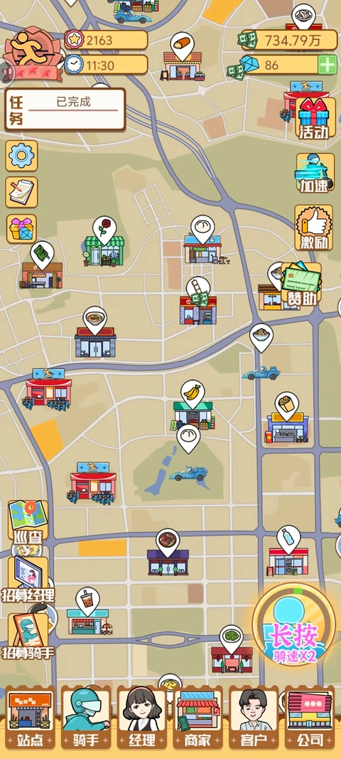 玩家可点击屏幕下方的站点、骑手、经理、商家、客户、公司按钮来完成升级操作。