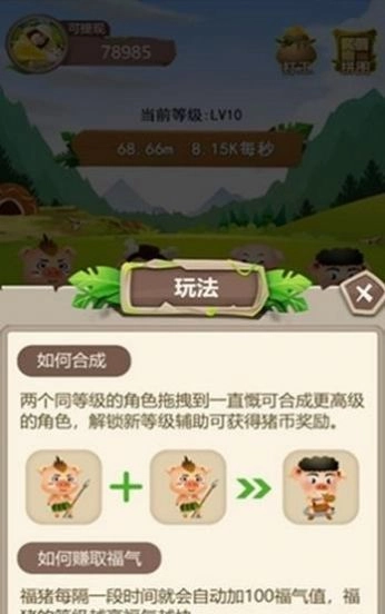 1、把两只等级相同的猪猪拖拽到一块,就能升级成更高级别的猪猪,升级完成后还能得到金币奖励。
