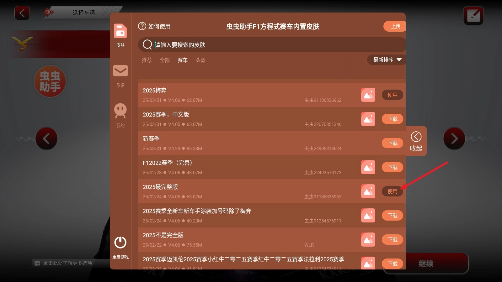 1、进入游戏后,先点击左侧的虫虫助手,接着就能看到各类皮肤,直接点击相应皮肤即可使用。
